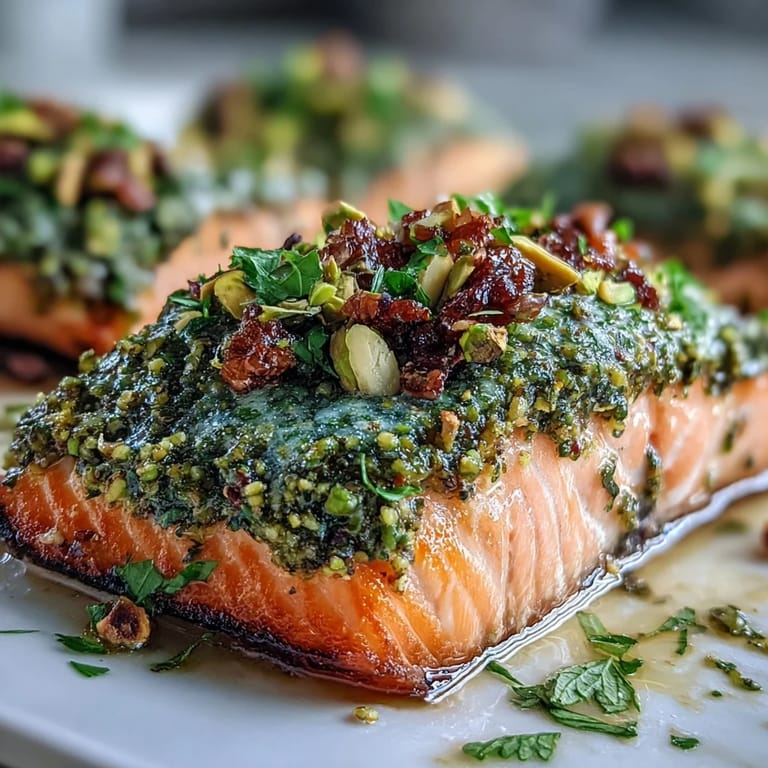 Save A neighbor once brought me a jar of homemade tahini after a trip to her family's village, and I stood in my kitchen wondering what to do with it beyond hummus. That same week, I had salmon fillets waiting in the fridge and a bag of pistachios from the market. I decided to confit the fish low and slow, then slather it with a tahini-pistachio paste spiked with fresh herbs. The result was so tender and fragrant that I've been making it ever since, especially when I want something impressive without the fuss.