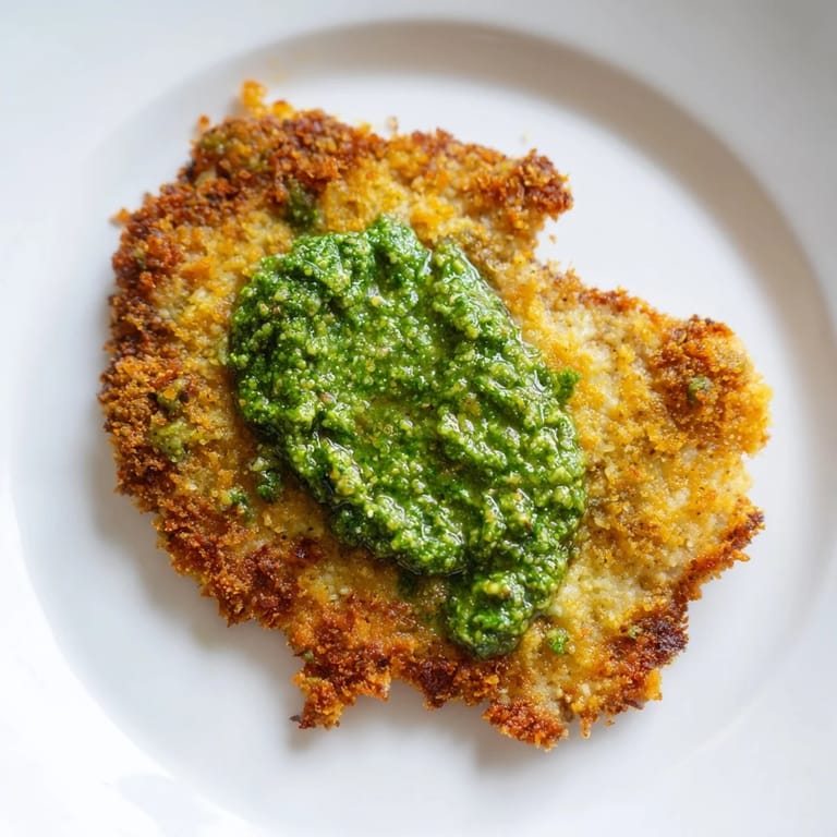Save The smell of Parmesan turning golden in hot oil is something that stops me mid-task every time. I was trying to use up some leftover pesto one Tuesday evening, tired from work and craving something both comforting and quick. I remembered a technique my neighbor mentioned about adding cheese directly into breadcrumbs, and suddenly these cutlets went from ordinary to unforgettable. The crust shattered perfectly under my fork, and that herby pesto on top brought everything together in a way that felt almost too easy for how good it tasted.
