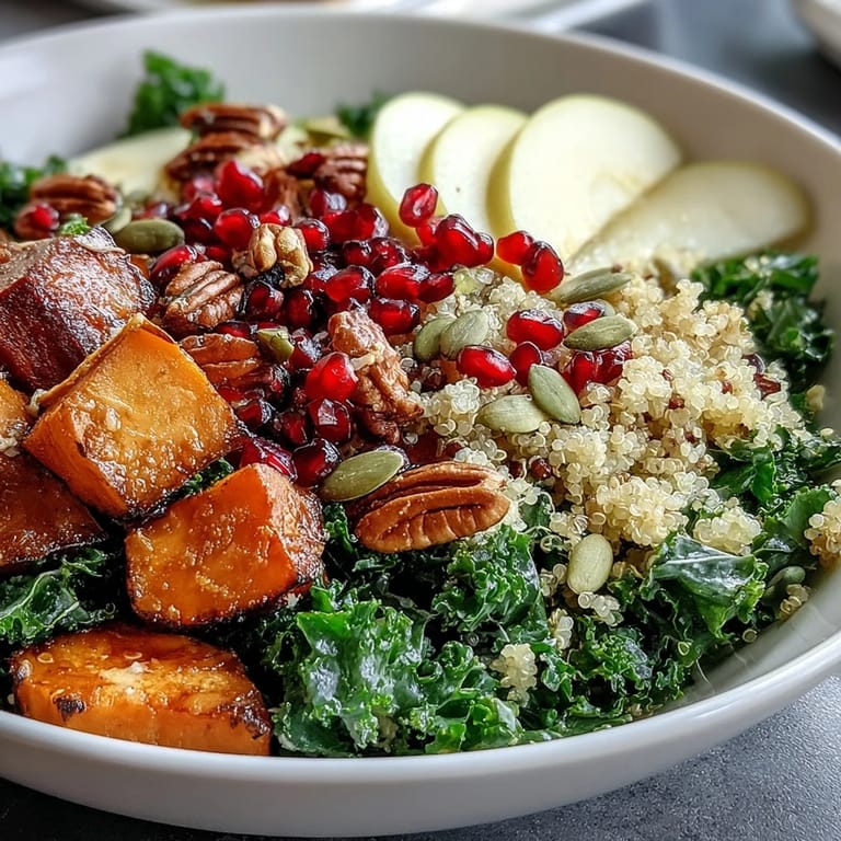 Save A vibrant, nutrient-packed grain bowl featuring tender kale, fluffy quinoa, roasted sweet potatoes, crisp apple, juicy pomegranate seeds, and crunchy pepitas, brought together with a tangy homemade dressing.