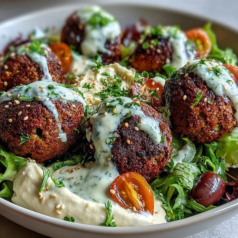 Save One afternoon, my neighbor showed up at my door with a container of homemade hummus and a challenge: make something interesting for lunch with what I had on hand. I opened my fridge to find salad greens, some forgotten falafel in the freezer, and a jar of tahini staring back at me. Twenty minutes later, I'd assembled this bowl that tasted like a Mediterranean vacation condensed into one plate, and honestly, it's been my go-to lunch ever since.
